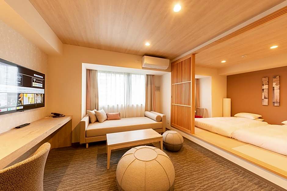 The spacious twin room provides air conditioning, a washing machine, as well as a private bathroom featuring a bath and a shower. The twin room features tatami floors, a seating area with a flat-screen TV, soundproof walls, a coffee machine, as well as a wardrobe. The unit offers 2 futons.